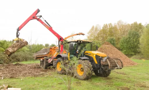 Intervention d'une broyeuse à la suite d'un chantier d'abattage de peupliers