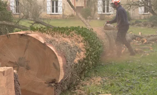 Abattage traditionnel d'un grand cédre mort sur pied sur la commune de Gencay
