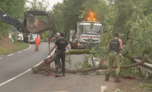Travaux d'abattage d'arbre sur la D749 au niveau de Bonneuil-Matours.