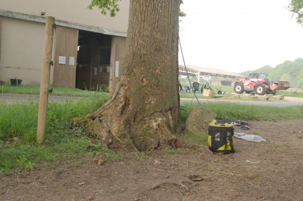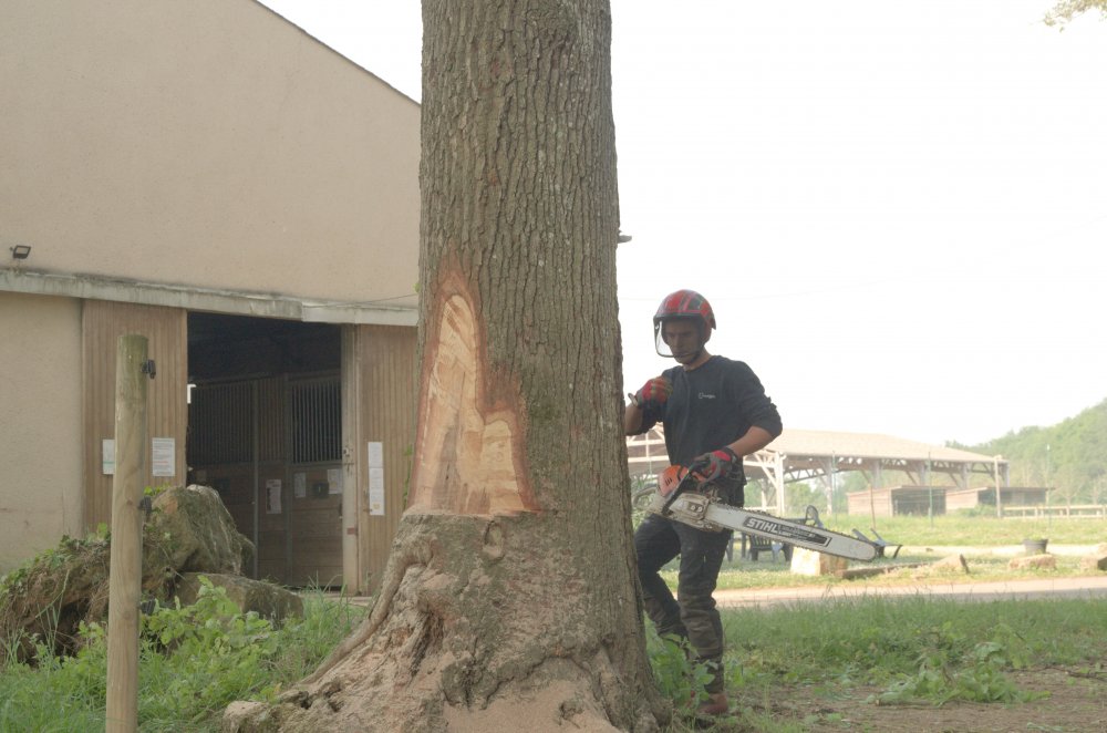 Le sujet à été cablé à l'aide d'un cable fortier concu pour le débardage, puis abattu de maniere traditionelle .