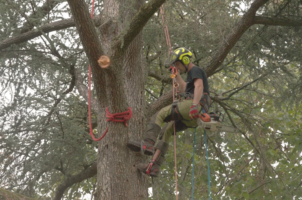 Comme l'ilustre une des photos, l'arbre présente un dépérissement avancé (visible au niveau du pied, et sur l'ensemble de la bille). La proximité à la maison d'habitation à contraint notre client à prendre la décision de le faire abattre. Notre équipe d'élagueurs est donc intervenu afin de procéder à l'abattage par démontage de ce cédre situé à Poitiers. Une grosse partie des sections ont étaient retenu lors de l'élagage grâce à un cabestan fixé sur le pied de bille. Maniére inovante de réaliser un démontage en ne provoquant aucun dommage au sol.